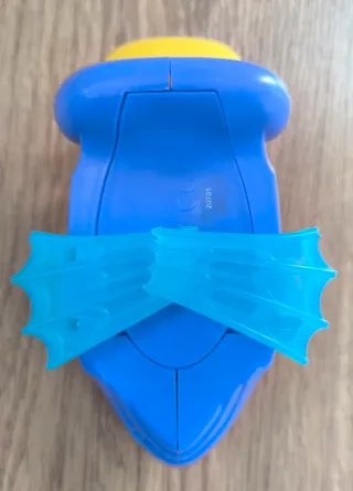 Silla de baño de color azul para bebés, con detalles en naranja y amarillo. - Diseño ergonómico para mayor comodidad. - Base estable para seguridad. - Incluye dos botones giratorios de colores.