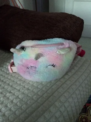 Riñonera de peluche con diseño de unicornio, ideal para niñas. Sus colores pastel la hacen muy llamativa. - Diseño de unicornio con cuerno y orejas. - Material de peluche suave. - Colores: rosa, azul y blanco. - Cierre de cremallera.