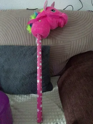 Divertido caballito de palo con forma de unicornio. - Cabeza de peluche rosa. - Crin multicolor. - Palo con estrellas blancas.