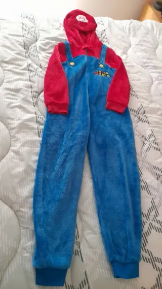 Pijama de una pieza con capucha, inspirado en Super Mario, talla 9-10 años - Diseño de mono de trabajo azul con camiseta roja. - Detalle de botones amarillos en el pecho. - Logo de Super Mario bordado. - Capucha con detalle de la 'M' de Mario.