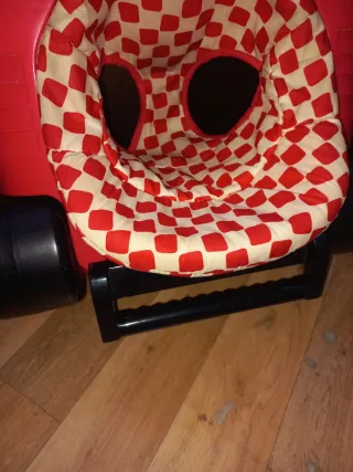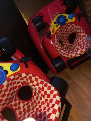 Se venden dos andadores con diseño de coche de carreras. - Color rojo. - Asiento con estampado de cuadros. - Ruedas negras.