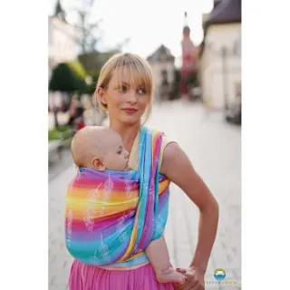 Fular tejido de la marca Little Frog con un diseño de arcoíris y espigas. - Tejido suave y resistente. - Diseño colorido y alegre. - Ideal para portear bebés.