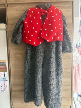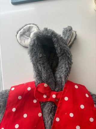 Disfraz de ratón para niños, ideal para fiestas o eventos. - Mono de pelo gris. - Chaleco rojo con lunares blancos. - Pajarita a juego. - Cremalleras traseras independientes en espalda y cabeza - Talla 4,6 años