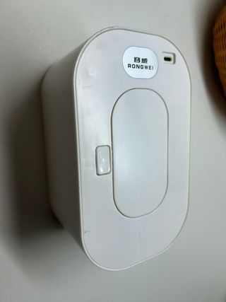 Dispositivo para mantener las toallitas húmedas a una temperatura agradable. Su diseño es compacto y moderno. - Color blanco. - Etiqueta con marca 'RONGWEI'.