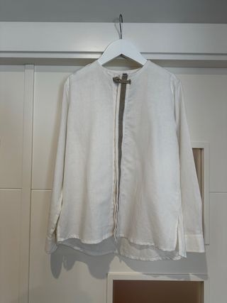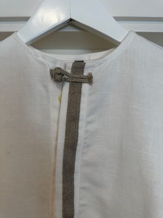 Camisa blanca de lino para niño, ideal para ceremonias o eventos especiales. Su diseño elegante y tejido natural la hacen perfecta para ocasiones importantes. - Material: Lino. - Cuello redondo. - Cierre con detalle de nudo y botones. - Talla 8 - Marca Varones