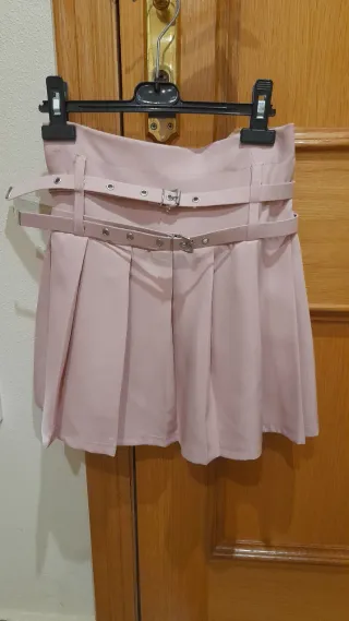 Falda de tela rosa para niña, cómoda y con un diseño alegre, con dos cinturones de adorno. Talla 12 años