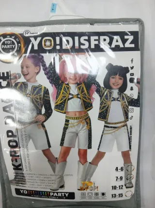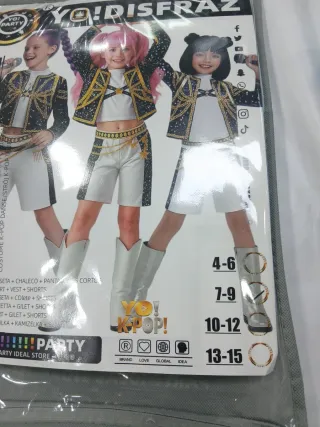 Disfraz de K-Pop para fiestas o eventos. - Incluye camiseta, chaleco y pantalones cortos. - Tallas disponibles: 7-9 años.