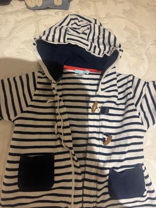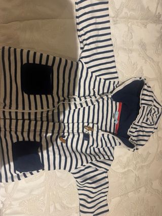 Chaquetilla de estilo marinero para niño, con un diseño de rayas clásico y práctico. - Capucha incorporada. - Cierre de botones de madera. - Bolsillos frontales. Talla 23 Meses.