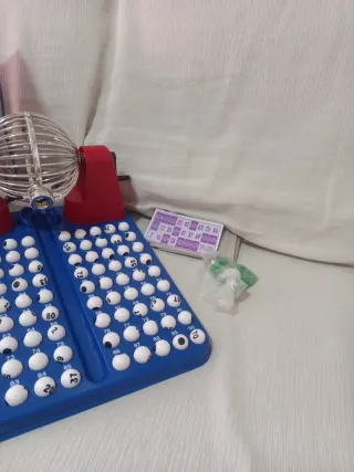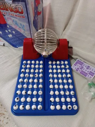 Juego de bingo completo para horas de diversión. Incluye el bombo, bolas y tarjetas. - Bombo metálico con base azul y soportes rojos. - Bolas numeradas. - Tarjetas de bingo incluidas.