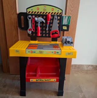 Banco de trabajo de juguete para niños, ideal para fomentar la creatividad y el juego. - Incluye herramientas de plástico como martillo, sierra y destornillador. - Incorpora un tornillo de banco de juguete. - Bandeja de almacenamiento roja. - Diseño colorido y resistente. Como aparece en la foto el taladro tiene el mango roto pero se le puede hacer girar y una pequeña raja.
