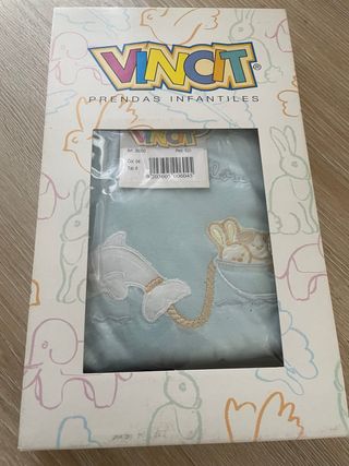 Pelele de bebé de la marca VINCIT, con un diseño infantil. - Color: Azul claro. - Talla: 6. - Diseño con un delfín y un conejito. - Prenda infantil.