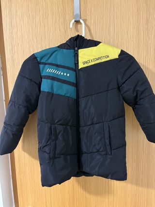 Chaqueta acolchada para niño con un diseño moderno y llamativo. - Paneles de color negro, verde azulado y amarillo. - Detalle de SPACE X COMPETITION en amarillo. - Rayas blancas y estrellas en el panel verde azulado.