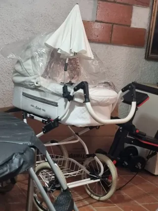 Conjunto de carro de bebé y silla de coche en color blanco y detalles dorados. - Silla de paseo con capazo. - Silla de coche para recién nacido Usado poco tiempo y en excelente estado. Tiene 3 piezas