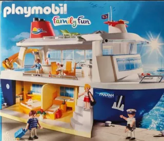 Set de crucero de la línea Family Fun de Playmobil. Incluye figuras y accesorios para recrear divertidas vacaciones. - Barco con varios niveles y tobogán. - Habitaciones interiores detalladas. - Figuras de pasajeros y tripulación.