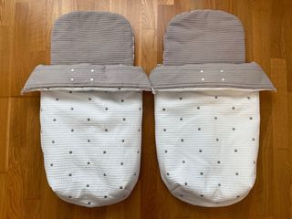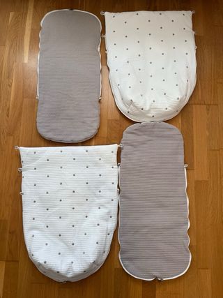 Conjunto de dos sacos para capazo con garnitura (cubre capazo) a conjunto de la marca Uzturre. Son de tejido tipo gofre en color blanco con topos grises y la parte superior en gris. Precio por cada saco. Ambos por 100€.