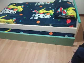 Cama nido con un diseño infantil y divertido, ideal para habitaciones de niños. Incluye un armario integrado para almacenamiento adicional. Cochones no ecluedos