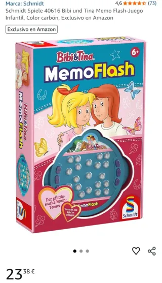 Juego de memoria Memo Flash de Bibi & Tina de Schmidt Spiele. Este juego tiene como valor educativo mejorar el rendimiento de la memoria y las habilidades cognitivas a través de un juego divertido y desafiante. - Edad recomendada: 6+ años. - Diseño exclusivo de Amazon. - Dos modos de juego: individual o por parejas. - Funciona con pilas.