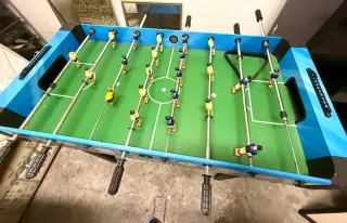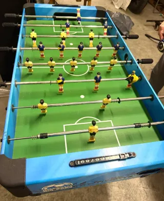 Futbolín de mesa con diseño divertido y listo para horas de entretenimiento. - Campo de juego verde. - Figuras de jugadores en azul y amarillo. - Barras metálicas para el control de los jugadores. - Marcador integrado para llevar la cuenta de los juegos.