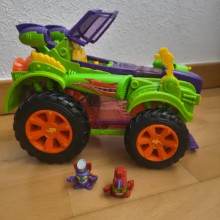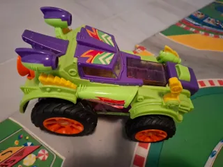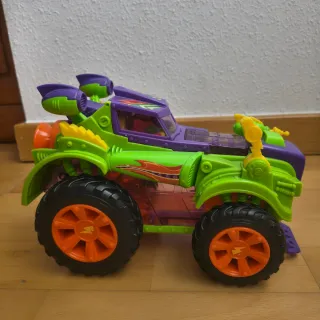 Coche de juguete Traga Superthings, con un diseño llamativo y divertido. - Colores: verde, morado y naranja. - Ruedas grandes todoterreno. - Detalles de llamas y propulsores.