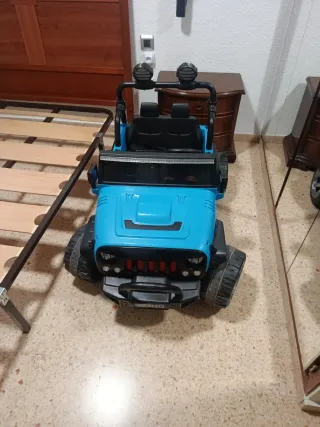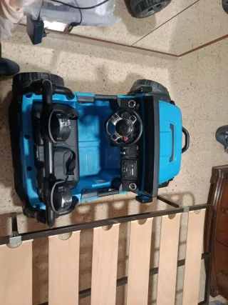 Coche eléctrico para niños en color azul. - Diseño tipo todoterreno. - Asientos dobles. - Ruedas grandes.
