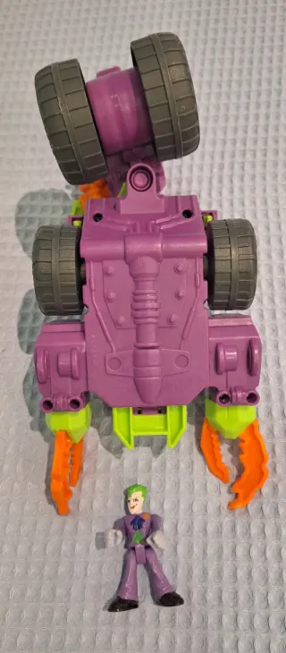Vehículo de juguete inspirado en The Joker, con un diseño llamativo en morado y naranja. - Figura de The Joker incluida. - Pinzas delanteras. - Ruedas grandes.