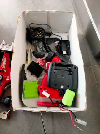 Lote de coches teledirigidos para reparar o cambiar las baterías - Coche todoterreno negro y rojo con ruedas grandes. - Coche de carreras rojo con alerón. - Coche azul metálico con ruedas transparentes. - Mando a distancia incluido.