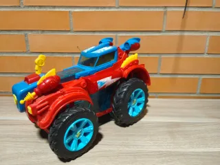 Coche de juguete de superhéroe con diseño llamativo. - Colores rojo, azul y amarillo. - Ruedas grandes todoterreno. - Detalles de escudo de superhéroe.