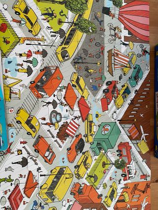 Puzzle de piezas grandes de vehículos. Muy entretenido jugar a buscar cosas. cuento incluido. La caja riene restos de cartulina marrón porque fue utilizada para disfraz como maletín, con paciencia se va quitando. Más juegos, puzzles, juguetes y cuentos en el perfil