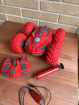 Coche teledirigido de color rojo con ruedas grandes y mando. ⚠️ Defecto: uno de los tornillos de la tapa de las pilas no se puede enroscar, pero no afecta al funcionamiento del coche. En buen estado general. - Coche teledirigido. - Mando a distancia. - Bomba de aire. - Cable USB.