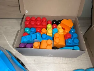 Gran caja de 55x38x28 cms llena de piezas de construcción tipo Lego. Incluye una variedad de bloques y bases para crear todo tipo de estructuras. - Base verde grande. - Base azul grande. - Bloques de construcción de varios colores y tamaños. - Piezas curvas y tubulares. - Muchos coches