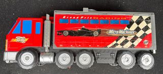 Camión de juguete Micro Machines con temática de carreras. - Diseño de camión de transporte. - Decoración Grand Prix Racing. - Incluye imagen de coche de Fórmula 1. - Bandera a cuadros y logo Micro Machines en el lateral.