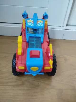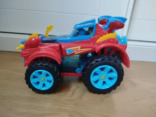 Coche de juguete de Superzings con un diseño llamativo. - Colores: azul, rojo y amarillo. - Ruedas grandes todoterreno. - Detalles de rayos. - Cabina transparente.