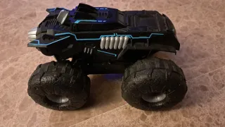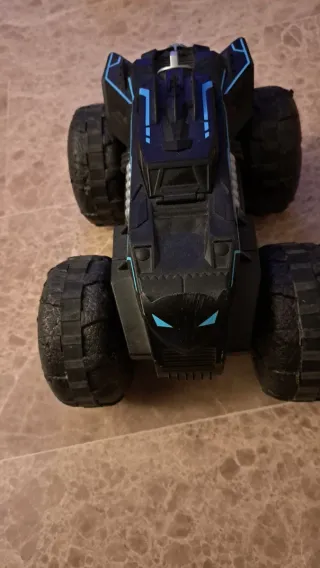 Coche teledirigido con diseño Batman. Cuenta con grandes ruedas todoterreno y detalles en azul. - Diseño inspirado en el Batmóvil. - Ruedas todoterreno de gran tamaño. - Detalles de color azul. - Acabado en color negro.