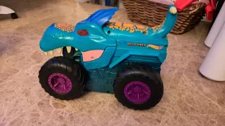 Camión monstruo Hot Wheels Mega Wrex con diseño de dinosaurio. - Color principal azul turquesa. - Con luces en los ojos y sonido cuando se come un coche. - Ruedas grandes todoterreno con llantas moradas.
