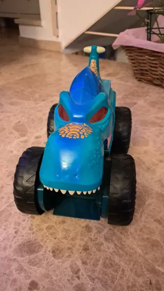 Divertido coche de juguete con diseño de tiburón. - Vehículo todoterreno con ruedas grandes. - Figura de monstruo verde incluida. - Accesorios de lanzamiento. - Colores azul y verde vibrantes. mide hasta 40 cm