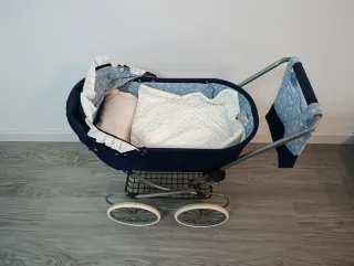Este coche de muñecas de estilo clásico es perfecto para jugar. - Capazo de tela azul marino. - Ruedas grandes con estructura gris. - Incluye bolso a juego. Nota: conjunto de trona, carro, armario y cuna por 70 euros.