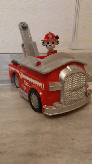 Coche de bomberos de Marshall de la Patrulla Canina con figura. - Coche de bomberos rojo y plateado. - Figura de Marshall con casco. - Escalera extensible. - Cuando se vuelve grande se mueve hacia agentes solo.