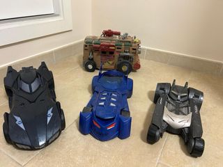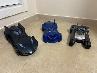 Tres coches de juguete inspirados en Batman. - Coche negro con diseño angular. - Coche azul con detalles deportivos. - Coche negro y plateado con ruedas grandes.