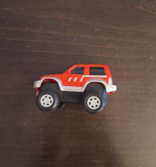 Coche de juguete todoterreno de color rojo y anaranjado. Es un coche pequeño y vistoso, ideal para niños. - Diseño reversible. - Color rojo con detalles anaranjados. - Ruedas grandes de goma.