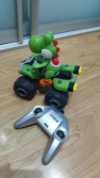 Coche teledirigido de Yoshi, personaje de Nintendo, listo para la acción. Incluye su mando a distancia para controlarlo. - Diseño verde y blanco característico de Yoshi. - Ruedas grandes para todo terreno. - Mando a distancia plateado con controles.
