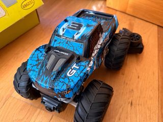 Coche teledirigido todoterreno en buen estado. Tiene algunos pequeños desperfectos en la carrocería, tal y como se puede apreciar en las fotos. - Es de color azul. - Tiene neumáticos grandes para una mejor tracción. - Incluye carrocería y ruedas.