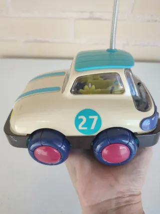 Coche teledirigido de juguete con un diseño divertido y colorido. - Carrocería de color crema con detalles en azul. - Ruedas grandes en azul con centro rosa. - Número 27 en un círculo azul en el lateral. - Antena flexible en la parte superior. - Se mueve hacia delante y gira. Fácil manejo Está en perfecto estado de funcionamiento