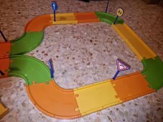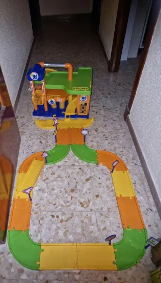 Divertido garaje de juguete con pista para coches, ideal para horas de juego. - Incluye garaje con ascensor y rampas. - Pista modular de colores (naranja, verde, amarillo). - Señales de tráfico y accesorios. NO INCLUYE COCHES. Tamaño grande.Hago envios.