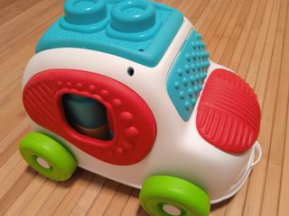 Divertido coche de juguete para bebés con piezas de colores que encajan. - Incluye figura de osito conductor. - Tonos naranjas, amarillos, verdes y morados.