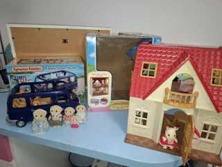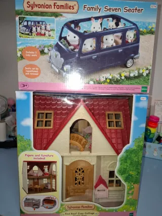 Se vende lote de Sylvanian Families que incluye el coche Family Seven Seater y la casa Red Roof Cosy Cottage Starter Home. - El coche Family Seven Seater incluye 3 asientos para bebé que se pueden mover y quitar. - La casa Red Roof Cosy Cottage viene con figuras y muebles incluidos. - Incluye la familia Dog, y todo lo que aparece en las fotos. - Precio negociable.