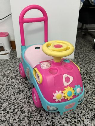 Coche de juguete para bebés, ideal para aprender a caminar y jugar. - Diseño colorido con volante y asiento. - Empujador trasero para que los adultos ayuden. - Ruedas verdes y detalles divertidos. The sounds dont work anymore