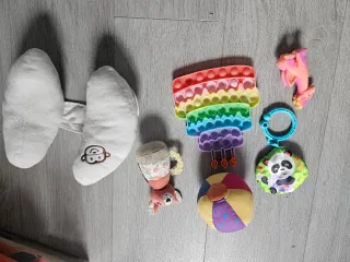 Lote de varios juguetes para bebé, ideal para estimular sus sentidos y motricidad. - Peluche blanco con forma de almohada para el coche. - Juguete sensorial Pop It pastel. - Pelota de tela multicolor. - Peluche de zorro mordedor sonajero. - Peluche de dragón. - Colgante de actividad con sonajero de panda.