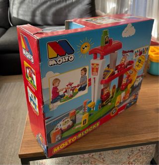 Set de juego Molto Blocks con estación de bomberos, un coche y bloques. Esta divertida estación de bomberos cuenta con: - 10 bloques Molto. - 1 coche electrónico (botón para luz y sonido) - Elevador mecánico. - Ascensor con trampilla. Es fácil de guardar y transportar. Muy seguro y resistente. Este juguete ayuda al desarrollo sensorial y la psicomotricidad del bebé. Edad recomendada: +12 meses. Lo vendo porque por otro lado nos regalaron el mismo y no tenemos el ticket de compra.