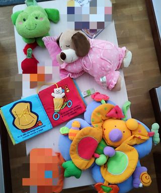 Lote de juegos para bebés: MARIPOSA de actividades, con texturas RANA musical para colgar en el coche, silla, cuna, etc suena una canción de cuna al tirar de la cuerda PERRITO dulce sueños con sonajero, es muy amoroso LIBRO OSITO Un libro de tela SUPER suave para descubrir junto a los bebés las primeras rutinas diarias ¿Qué hace hoy osito? Una compañía ideal para la hora de comer, de bañarse o de dormir, o para los momentos de juego. BUENAS NOCHES cajita musical con 50 cuentos para ir a dormir Los artículos se pueden vender por separado