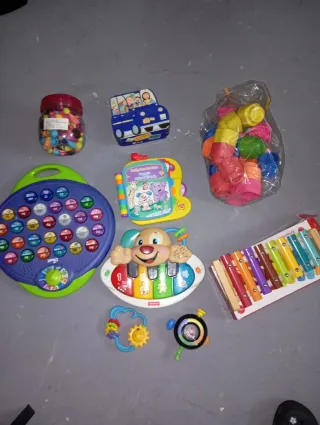 Lote variado de juguetes para bebés, ideal para estimular el aprendizaje y la diversión. - Piano musical con forma de perrito. - Libro interactivo con animales. - Xilófono de madera. - Juego de encajables. - Coche de juguete. - Tarro con figuras. - Bolsa con piezas de colores.
